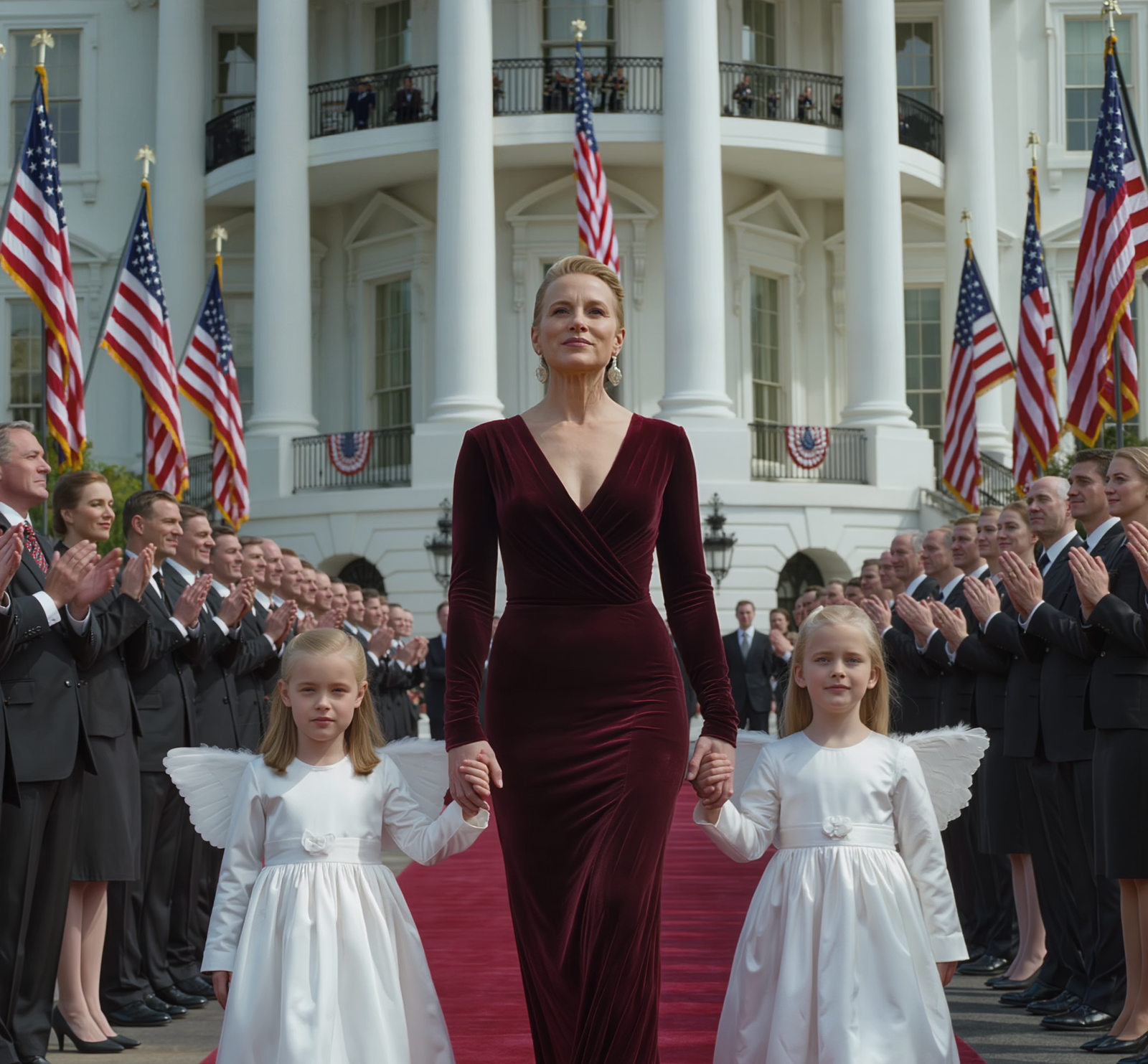 She wore a deep red velvet gown that fit her perfectly. A diamond necklace sparkled against her collarbone. Her posture was confident. Her face calm, elegant, powerful.