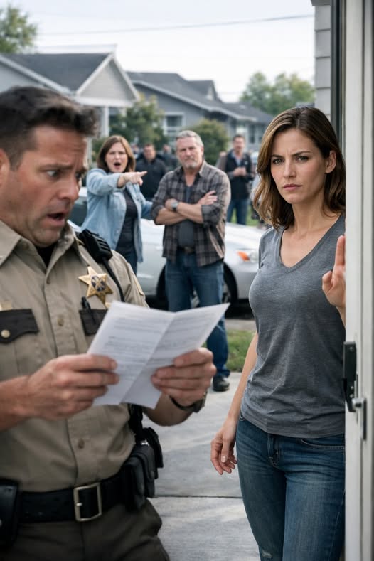 A deputy sheriff stood on her porch in a tan uniform with a black vest. Clipboard. Papers. Hands positioned like he’d done this a hundred times. Behind him, a patrol car at the curb with no flashing lights, as if discretion made an eviction gentler.